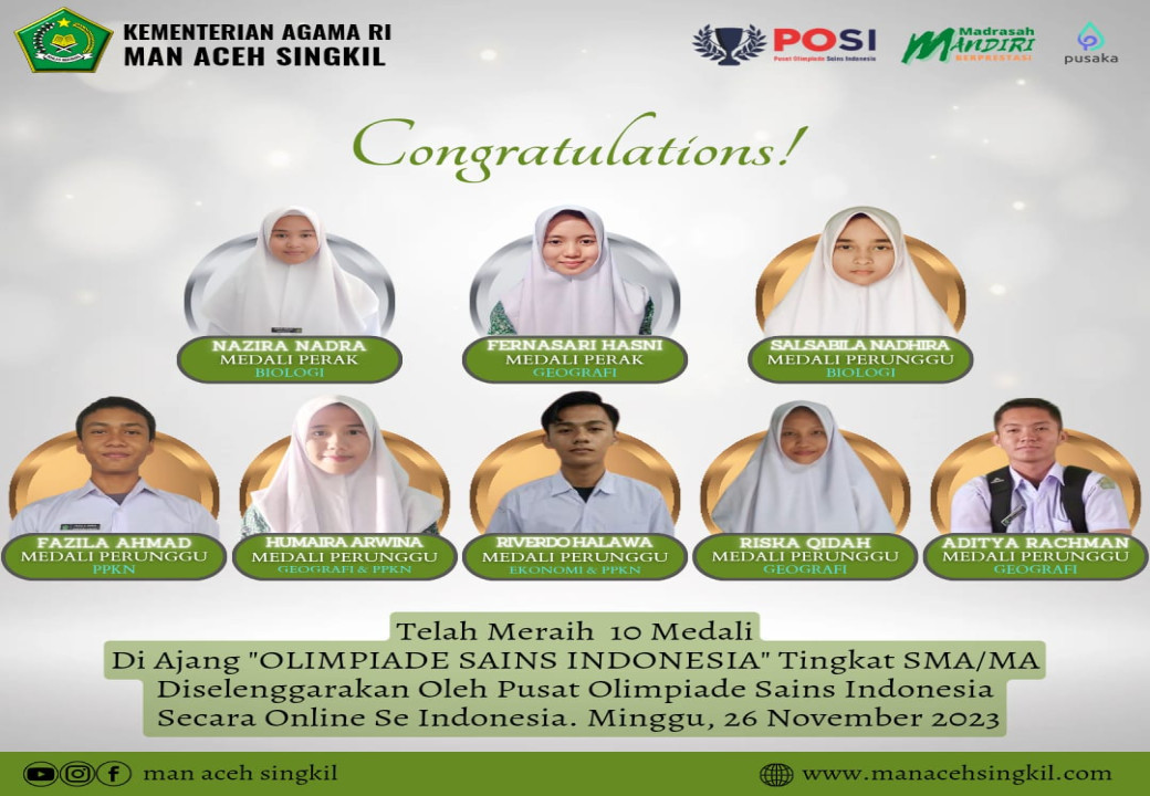 Singkil - Sebanyak 10 Medali Juara Olimpiade Sains Indonesia kembali diraih siswa dan siswi terbaik MAN Aceh Singkil yang mengikuti Kompetisi Olimpiade Sains Indonesia Tahun 2023.
